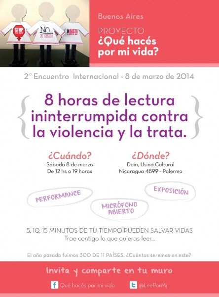 EN BUENOS AIRES EL 8 DE MARZO–II Encuentro internacional ¿Qué hacés por mi vida? 8 horas de lectura ininterrumpida contra la violencia y la trata. Convocatoria abierta a todos los que quieran leer. A partir de las 12hs en Dain, Usina Cultural (Nicaragua 4899, Palermo) Bajo la pregunta que se hacen las víctimas de trata y violencia, ¿Qué hacés por mi vida?, el próximo...